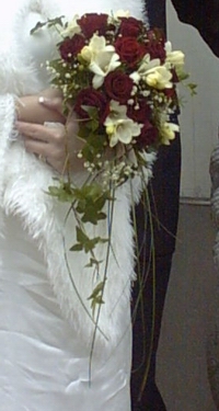 Työpaikan lähellä olevan kukkakaupan floristi/myyjä oli jotenkin nihkeä ja tuntui siltä, että hänen luokseen olisi pitänyt mennä joko valmiin kuvan tai setelinipun kanssa, jotta hän olisi suostunut antamaan hinta-arvion tai keskustemaan kanssani. Rautatieaseman vieressä olevassa kukkakioskissa taas oli hurmaava mies, joka onnitteli heti ensimmäisenä (ihanaa!) . Hän osasi ehdottaa ja ideoida, mutta ohjasi sitten toiseen liikkeeseensä (ei kai vain se, jossa jo kävin?). Kotia lähellä oleva kukkakauppa taas ilmoitti ensin lapussa, että kauppa avataan taas 16.10. ja kun menin 16.10 siitä ohi, lapussa luki "Avataan 23.10.". Se siitä sitten. Kimppuni, vieheet ja hiuskukat tilasin Gallerian kukkakaupasta: tummanpunaisia ruusuja, murattia ja muuta mukavaa tarpeen mukaan, hieman rönsyilevä kimppu. Gallerian kukkakaupassa jokainen myyjä oli ystävällinen ja valmis ideoimaan (sekä he, joilta olen vain kysynyt hinta-arviota että hän, jolle tein varsinaisen tilauksen). Jussi saa kantaa entisajan ritarien mukaan morsiamensa väriä eli tummanpunaista ruusua, bestmanille tilasimme neilikan.