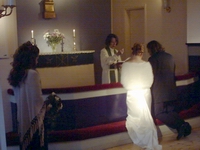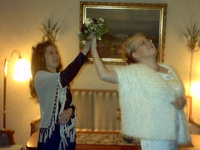 Aamulla pääsi lojumaan ammeeseen, kietoutumaan unisex-kokoiseen kylpytakkiin ja sujauttamaan jalkansa unisex-kokoisiin tossuihin. Sen jälkeen saikin vain odotella aamiaista, joka tarjoiltiin huoneeseen... Miksei joka aamu voisi saada aamiaista valmiiksi eteen kannettuna? John Grayn kirjasta puheenollen: hassua kyllä, jo sivulla 7 päädyttiin jo puhumaan syrjähypyistä... Niitä ei suositeltu, vaan todettiin, että jos intohimo ja romantiikka säilyy, ei syrjähyppyihinkään ole tarvetta. No, onhan se hyvä, että asia käsitellään noinkin nopeasti! Juhlapaikka Ykkösvaihtoehtomme ravintola Alberga oli valitettavasti pyhäinpäivänä kiinni. Haikaranpesään olisi taas joutunut muiden buffetvieraiden keskelle ja eräs espoolaisessa kauppakeskuksessa sijaitseva ravintola ei koskaan tainnut lähettää meille menuehdotuksia lupauksestaan huolimatta... Päädyimme valitsemaan juhlapaikaksi kartanokylpylä Kaisankodin. Olisimme jääneet sinne yöksikin, mutta idyllinen piharakennus oli valitettavasti varattu, joten päätimme valita sen sijaan hotelli Tornin hääpaketin (yllä). Kaisankoti oli viehättävä rakennustelineistä huolimatta ja meidät toivottivat tervetulleeksi Halloween-kummitus ja -kurpitsa sekä pöydillä olleet muoviötökät... Hihii! Meidän tilaamme ja pöytäämme ei kyllä oltu koristeltu ökkömönkiäisillä (toim. huom: Anjalankosken murteella sanottuna öhkömönkiäisillä) , muut huoneet kartanosta kyllä. Ruoka oli hyvää ja kakun loput sai pakattuna mukaan, joten kakkua riitti vielä vieraille matkaevääksi ja seuraavaksi päiväksi kahvin kanssa. Kihlat Pari on kihlautunut, kun he ovat sopineet menevänsä naimisiin. Muutama tuttu pariskunta jätti kihlasormukset ostamatta ja osti suoraan vihkisormuksen - mikäs se siinä, ei kihlautumiseen sormuksia tarvita, se lupaus avioliitosta vain... Me kihlauduimme 20.2.02 perinteis-tyypillisesti sormusten kera (niinkuin varmaan moni muukin, jolleivat jo 02.02.02 ehtineet...), mutta ilman kihlajaisjuhlia tai -kahveja. Kirkko - eli kappeli (eli varsinainen vihkiminen)